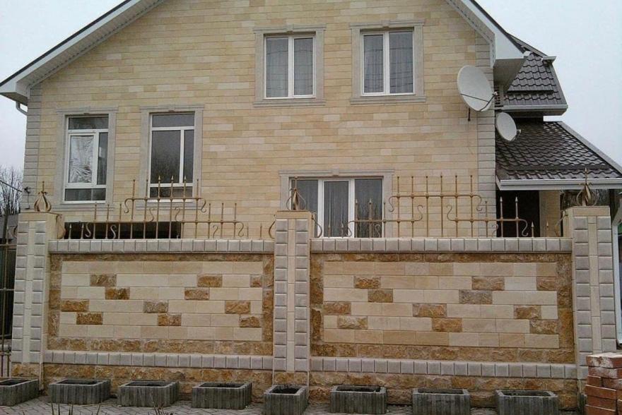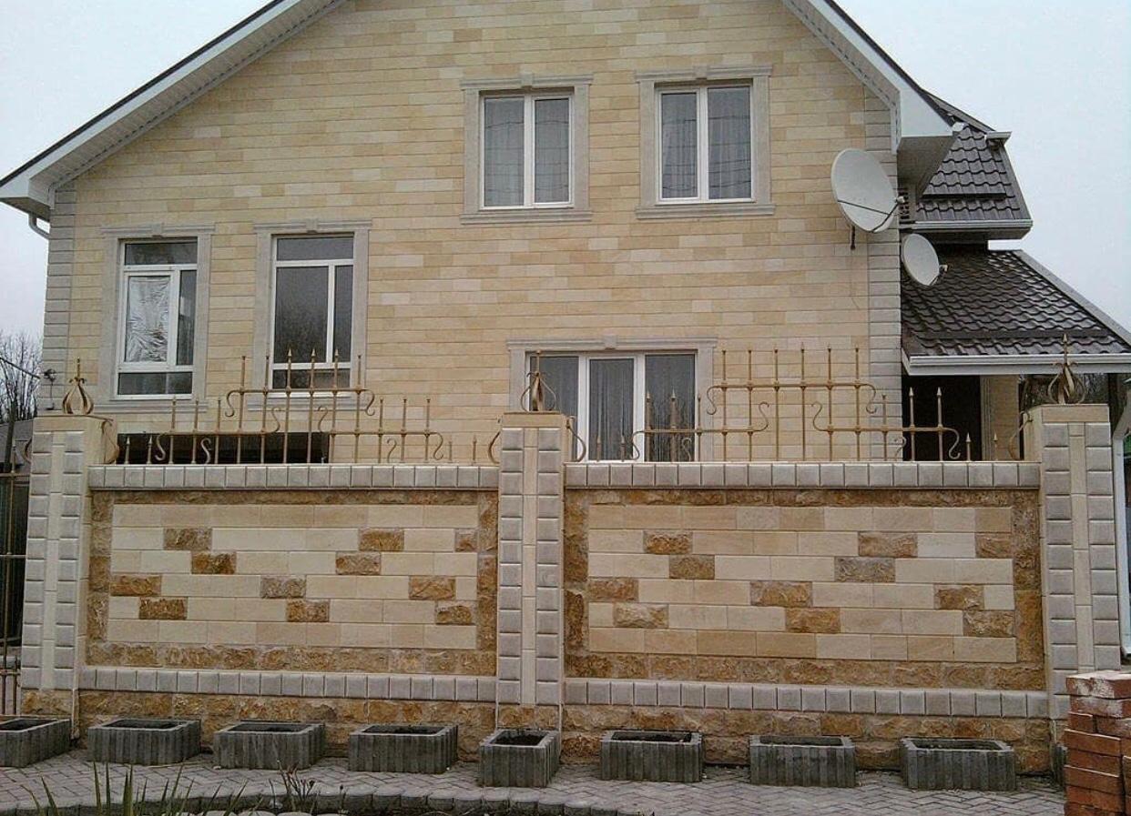Фасад дома - песчаник светло-желтый Акушинский 1400 р/м2 Забор - доломит Мекегинский колотый без фаски 1400 р/м2