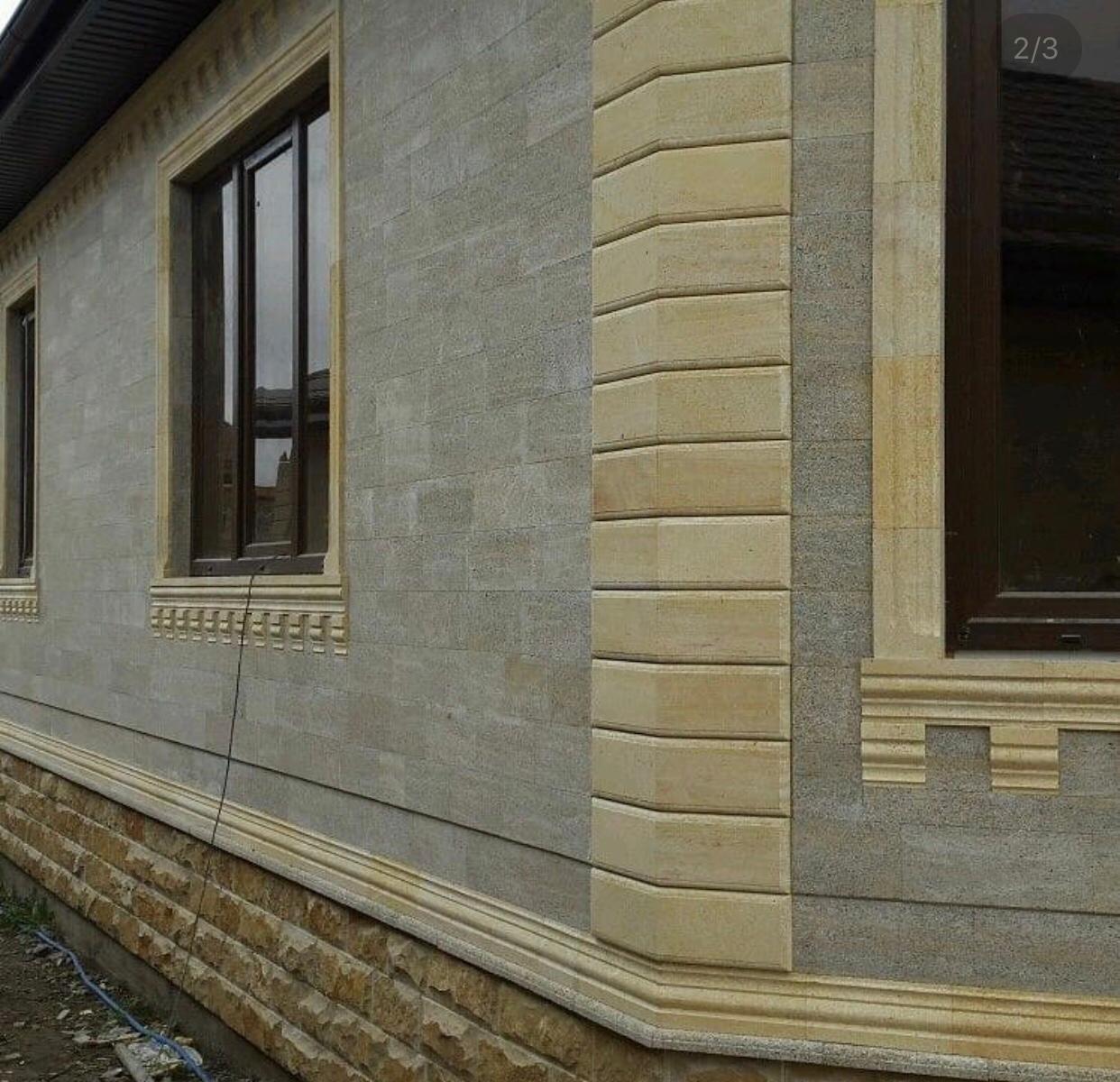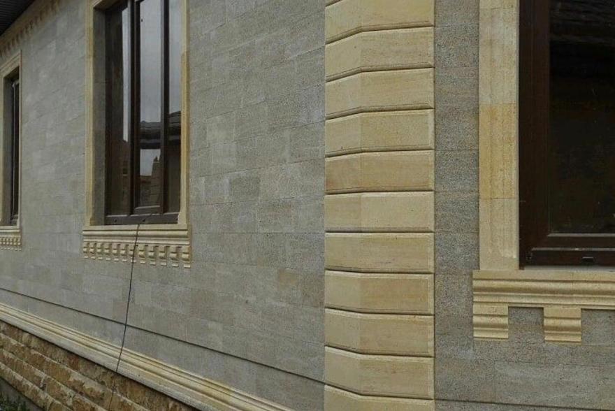 Фасад дома - известняк-ракушечник Каякенский серый 1400 р/м2 Обрамление песчаник светло-желтый Акушинский 1400 р/м2